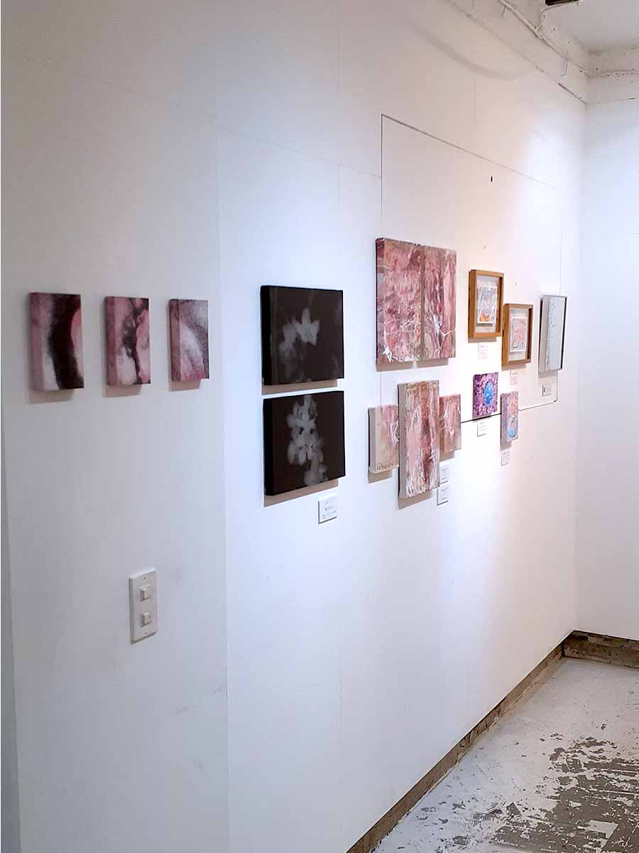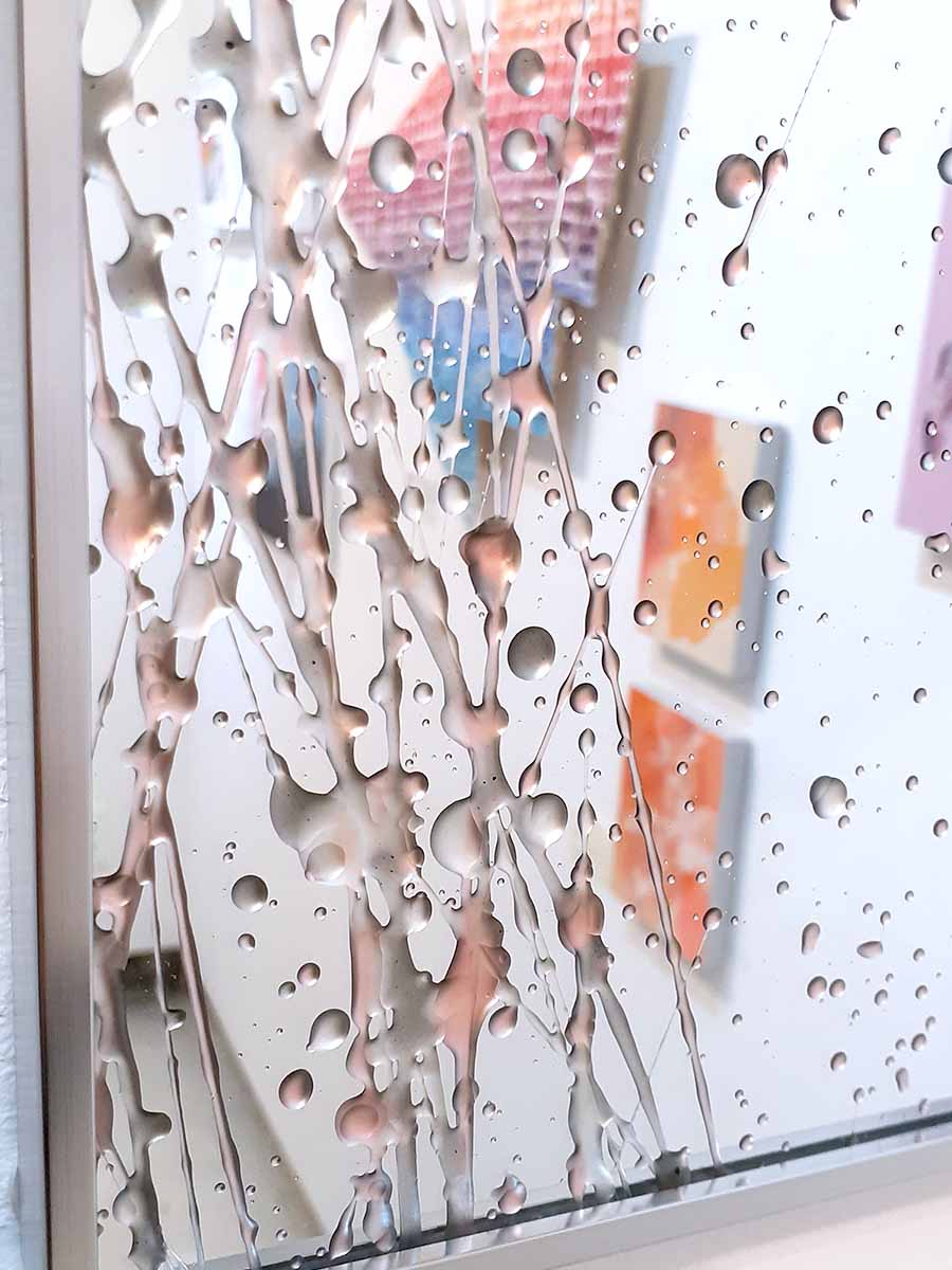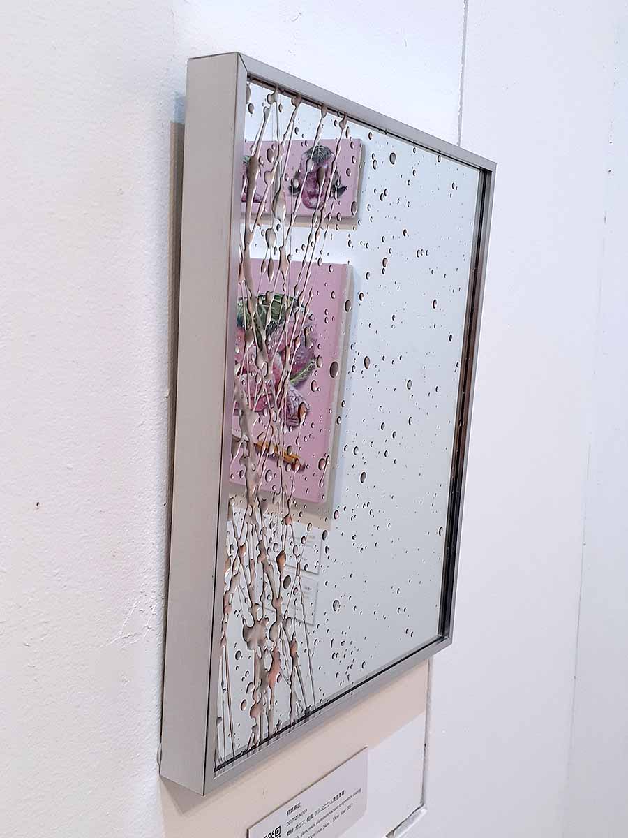 映り込んだ人影や空間も作品として落とし込まれた作品となっております。見る角度によって作品の面影が変わります。