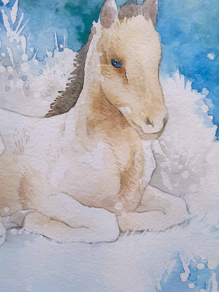 青を基調にした風景の中に馬が横たわっている作品です。そのたたずまいは落ち着きがあり、静けさを感じる作品となっています。