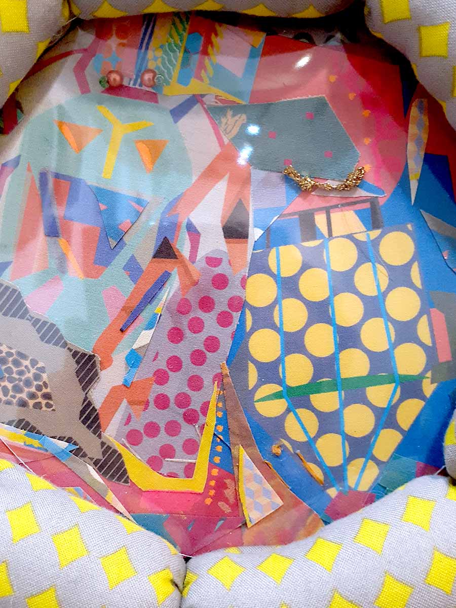 絵本のような風合いとカラフルな色合いが特徴的なコラージュアートです。
