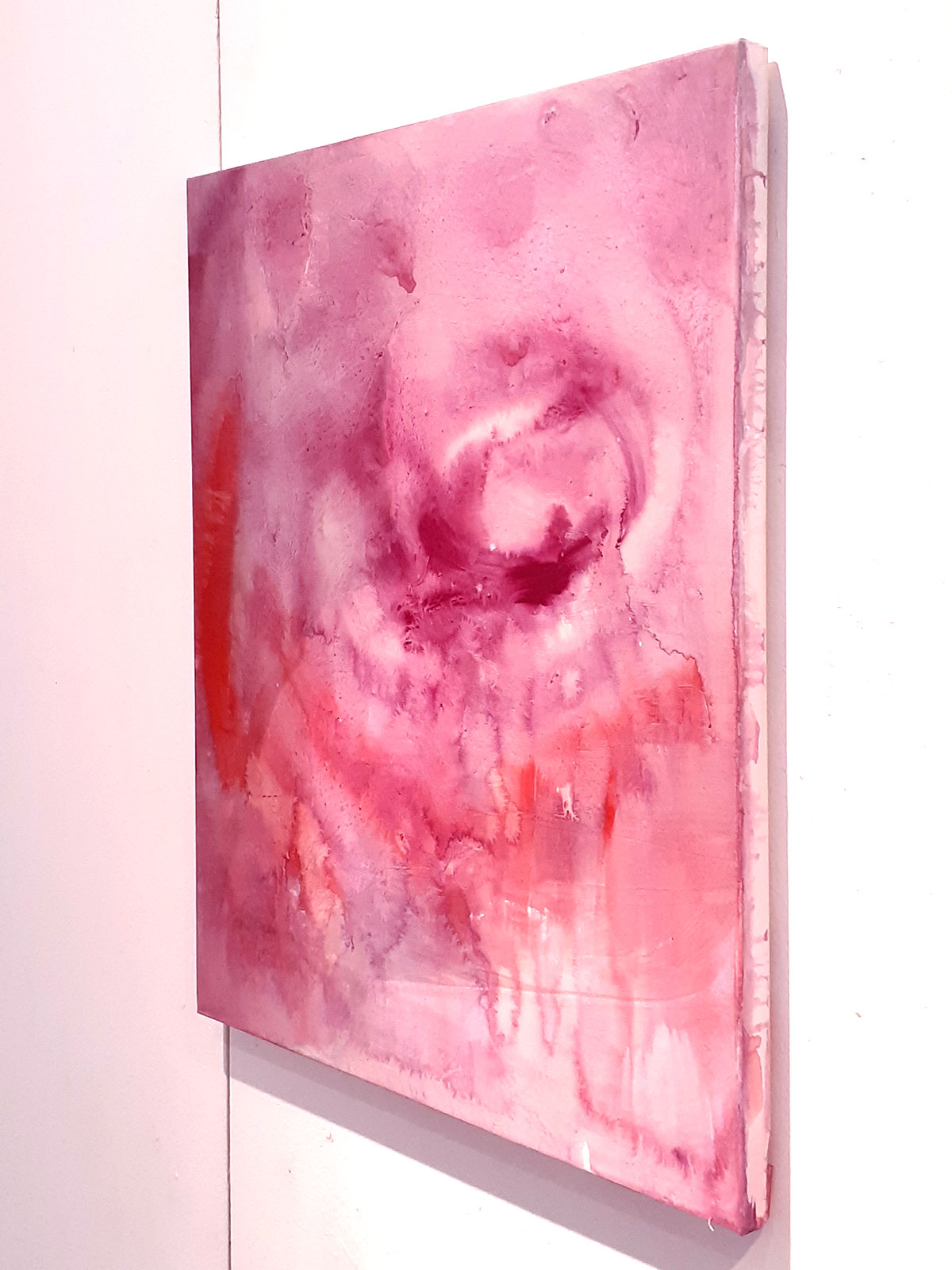 展示コンセプト: 直感的に描く行為と画面に現れるものに向き合う純粋な時間から、自己と世界における本質を炙り出そうと試みている。 衝動的な感覚と自らの秩序をもってそこに在る根源的な何かをすくいとり、絵画として力の宿るものへと昇華したい。
