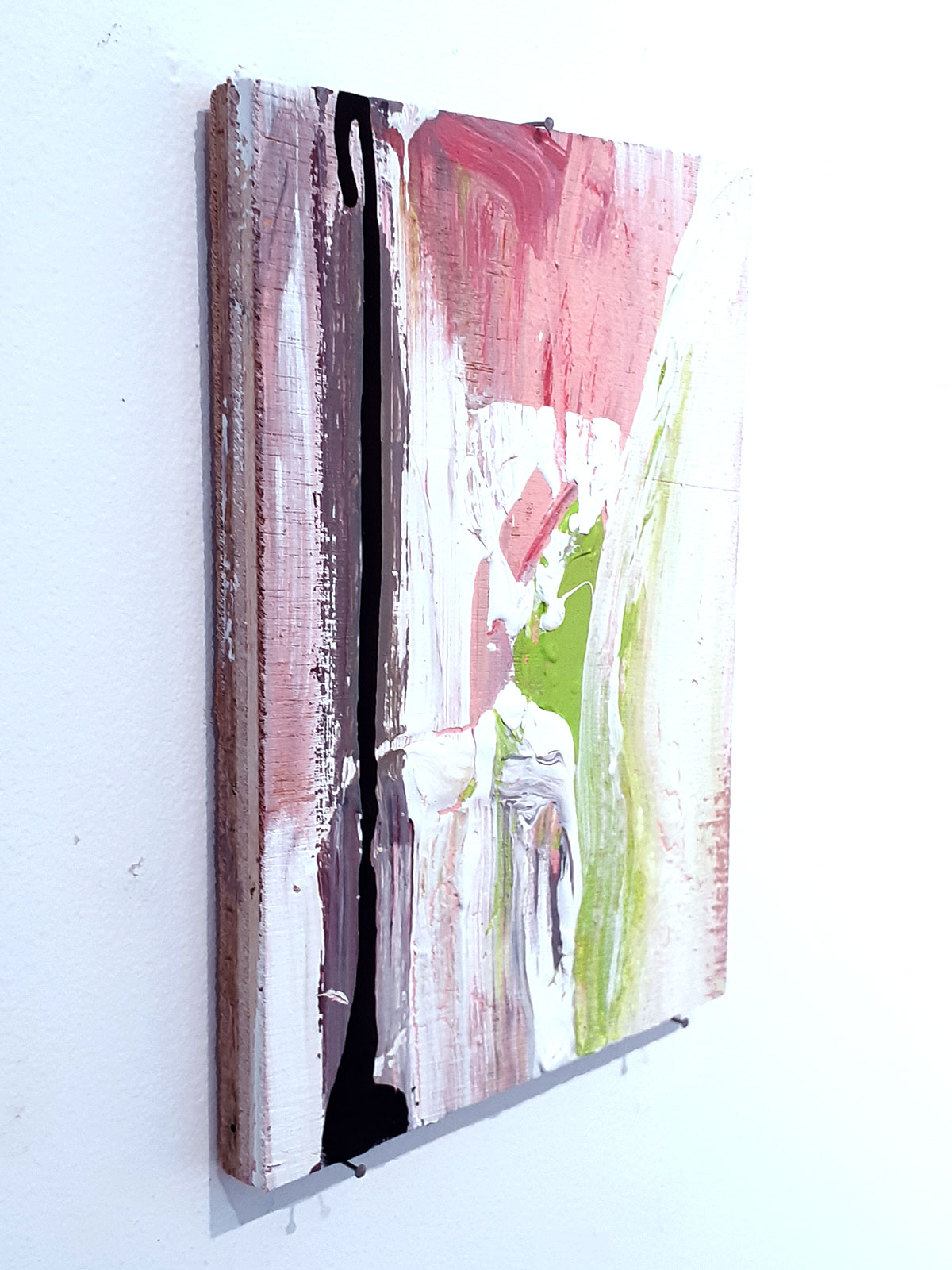 展示コンセプト: 直感的に描く行為と画面に現れるものに向き合う純粋な時間から、自己と世界における本質を炙り出そうと試みている。 衝動的な感覚と自らの秩序をもってそこに在る根源的な何かをすくいとり、絵画として力の宿るものへと昇華したい。