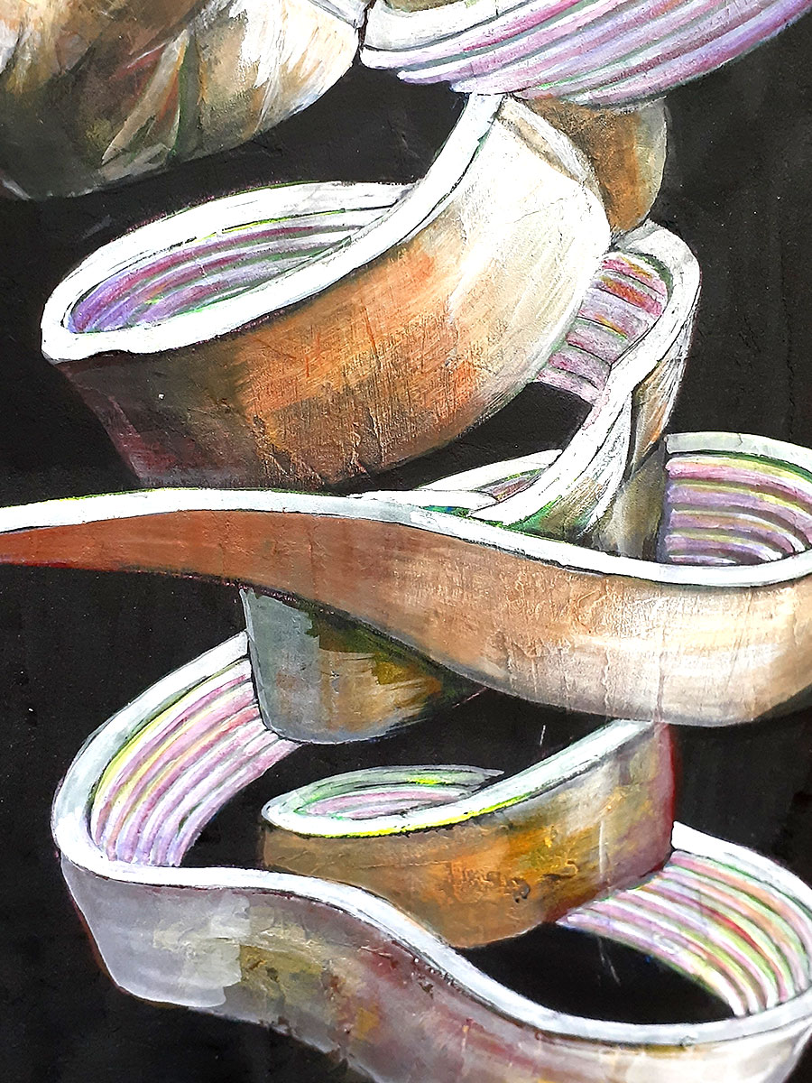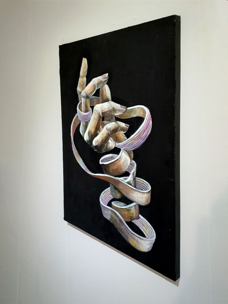 「成りたい自分とは何か?」を考える 帯状の物体は捲れながら身体を組み替える、また捲れて組み替えるを繰り返しながら自分の成りたい自分に形を変えようとしている姿です。 帯の裏地は構築・再構築を繰り返して生まれた要素を表しています。 今回の展示は、「成りたい自分」「成るまでの自分」をコンセプトに構築を繰り返す動物を制作しました。