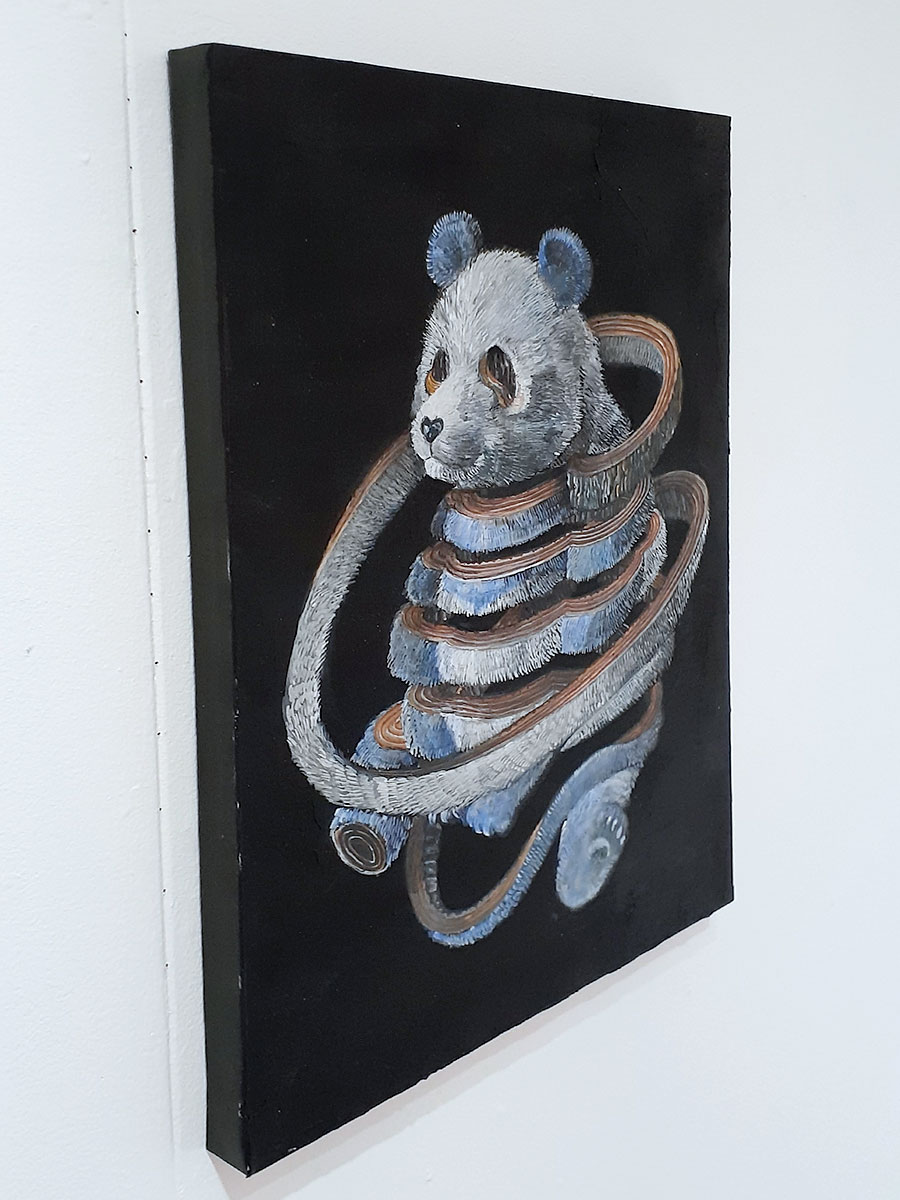 「成りたい自分とは何か?」を考える 帯状の物体は捲れながら身体を組み替える、また捲れて組み替えるを繰り返しながら自分の成りたい自分に形を変えようとしている姿です。 帯の裏地は構築・再構築を繰り返して生まれた要素を表しています。 今回の展示は、「成りたい自分」「成るまでの自分」をコンセプトに構築を繰り返す動物を制作しました。