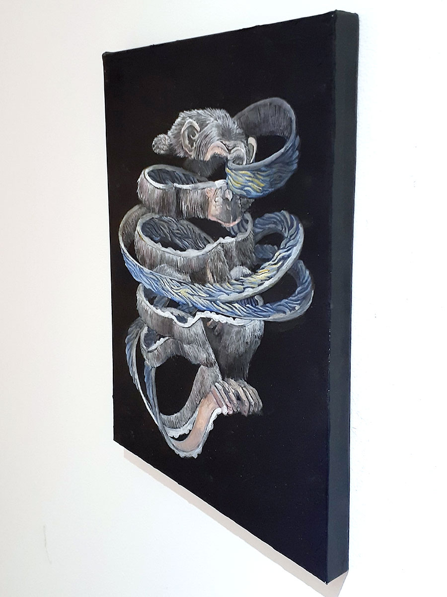 「成りたい自分とは何か?」を考える 帯状の物体は捲れながら身体を組み替える、また捲れて組み替えるを繰り返しながら自分の成りたい自分に形を変えようとしている姿です。 帯の裏地は構築・再構築を繰り返して生まれた要素を表しています。 今回の展示は、「成りたい自分」「成るまでの自分」をコンセプトに構築を繰り返す動物を制作しました。